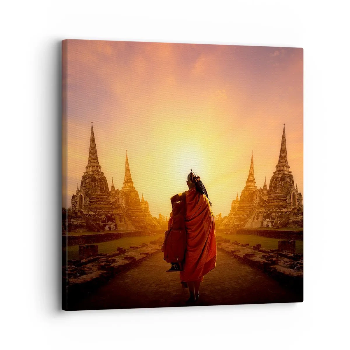 Het canvas wordt over het frame gespannen. De zijkanten en randen zijn bedrukt en zetten het beeld voort. De schilderij is klaar om aan de muur te hangen. Elk product heeft een hanger aan het frame en een montagekit (schroef + pin).