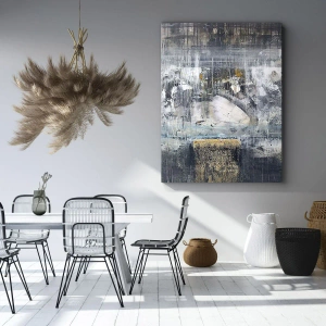 Het schilderij "Abstracte compositie in koele tinten" is een kunstwerk dat de aandacht trekt met zijn subtiele maar dynamische esthetiek. Het toont een abstracte compositie die gedomineerd wordt door koele grijs- en blauwtinten, afgewisseld met delicate goudaccenten. Dit werk brengt harmonie en een modern karakter in het interieur.
