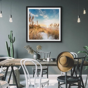 Het rustige landschap met blauwe lucht en warme zonnetinten contrasteert met het lichte zand en benadrukt de natuurlijke schoonheid van het kustlandschap. Dit motief is een uitstekende keuze voor natuurliefhebbers en liefhebbers van ontspannende uitzichten.
