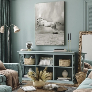 Het canvas wordt over het frame gespannen. De zijkanten en randen zijn bedrukt en zetten het beeld voort. De schilderij is klaar om aan de muur te hangen. Elk product heeft een hanger aan het frame en een montagekit (schroef + pin).