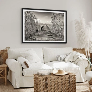 Poster in een zwarte lijst - Een houten brug tussen het riet over een sepiakleurig meer - 50x70cm - In de stilte van het gras - Moderne wanddecoratie voor woonkamer en slaapkamer ARTTOR