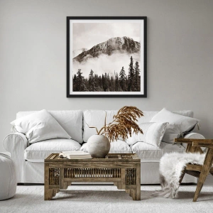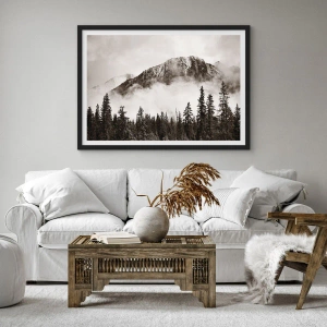- Deze poster toont een majestueus berglandschap omgeven door bomen en mist. Een subtiele zwart-witfoto, perfect voor minimalistische en elegante interieurs.