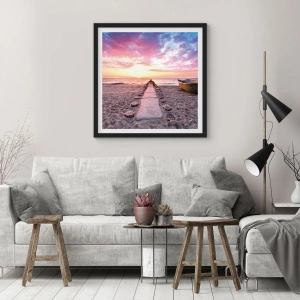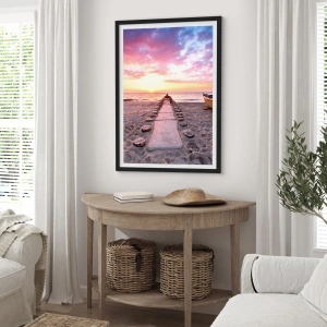 - De poster toont een romantisch pad dat van het strand naar de zee leidt bij zonsondergang, perfect voor interieurs vol rust en harmonie.