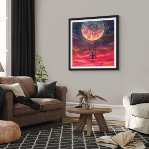 - Deze poster toont een meisje op een schommel onder een volle maan tegen een sterrenhemel in roze en paarse tinten. Perfect voor interieurs met een artistieke en dromerige sfeer. Formaat: 50x70 cm, inclusief zwarte lijst.