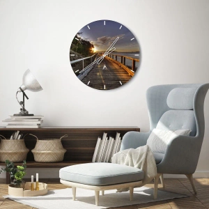"Keep Walking Towards the Sun" is een unieke wandklok met een schilderachtig uitzicht op een houten brug over het water bij zonsondergang. Deze afbeelding straalt harmonie en rust uit en past perfect in zowel natuurlijke als moderne interieurs.