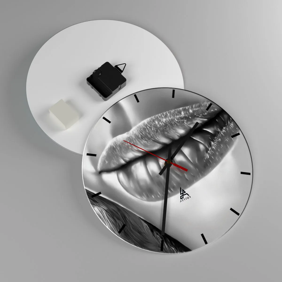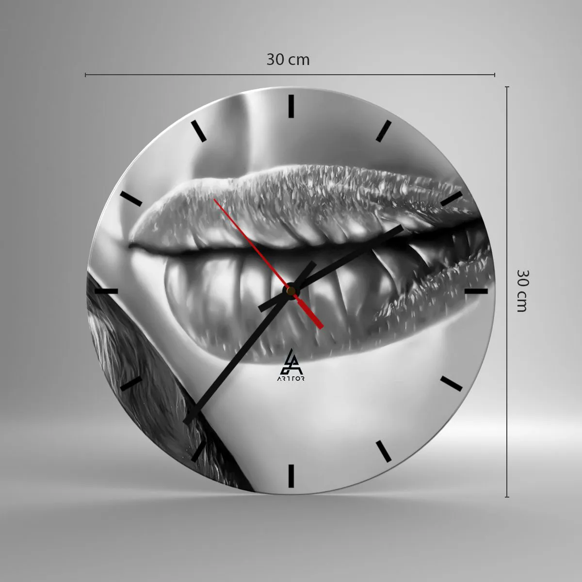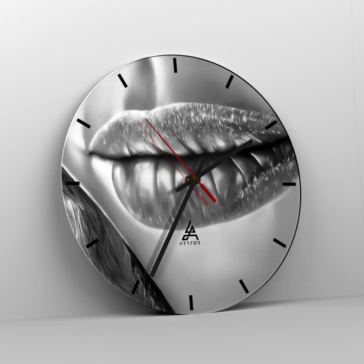 Het lippenmotief symboliseert passie, expressiviteit en esthetiek, en de artistieke uitvoering benadrukt het unieke karakter van het ontwerp. De zwart-wittinten voegen elegantie toe aan het algehele ontwerp, waardoor de klok niet alleen functioneel is, maar ook een esthetisch aantrekkelijk decoratief accent.