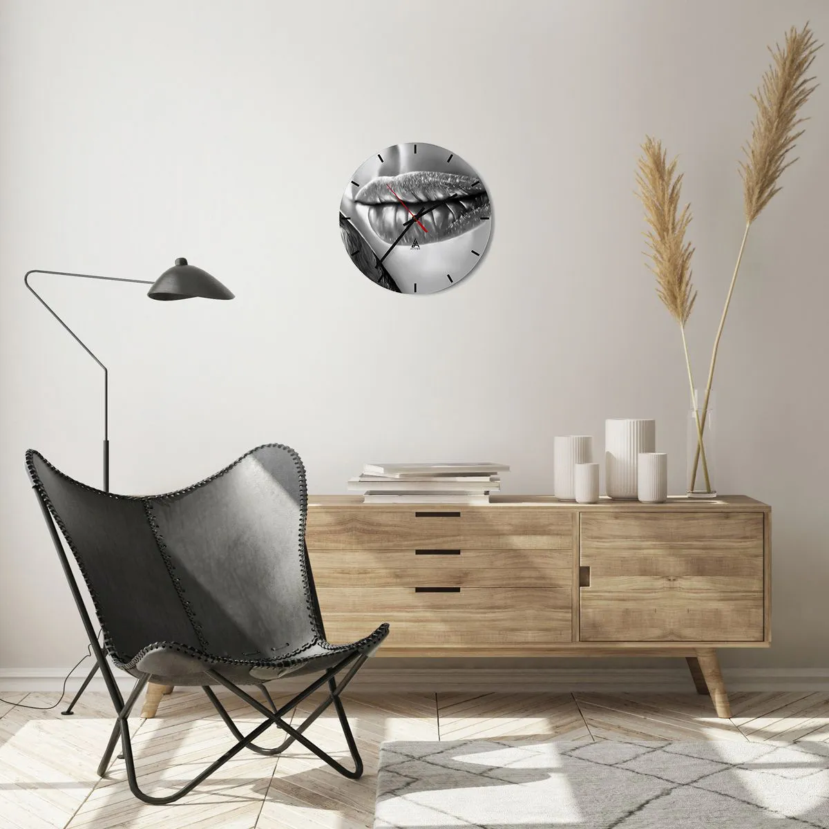 I Know What You're Thinking About... is een bijzondere wandklok die bekoort met zijn artistieke en verfijnde motief. Sensuele Lippen in Zwart-Wit brengt elegantie, subtiliteit en een vleugje mysterie in elk interieur. Het is een decoratie die perfect past in moderne, stijlvolle ruimtes.