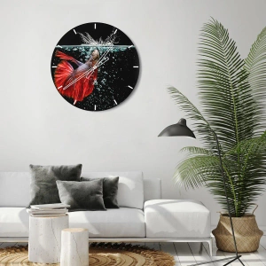 De klok is gemaakt van 4 mm dik gehard veiligheidsglas. De technologie van het maken van de klok voldoet aan de veiligheidsklasse 2B2 volgens de PN-EN 12600: 2004-norm, die weerstand tegen schokken garandeert. De klok op het glas is klaar om op te hangen - hij heeft een metalen hanger aan de achterkant van de klok en een schuimafstand die de even afstand tussen de klok en de muur regelt. De klok heeft een stil zwevend mechanisme dat wordt aangedreven door een batterij van 1,5 V - AA-batterij (batterij niet inbegrepen).