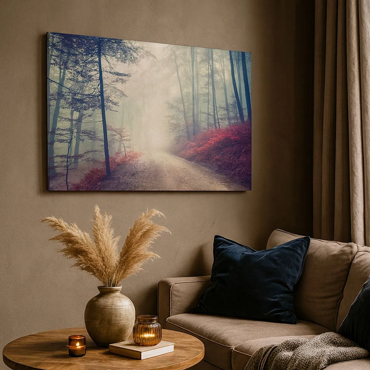 - Een schilderij van een magisch bospad, omgeven door mist en subtiele kleuren, perfect voor interieurs vol vrede en harmonie.