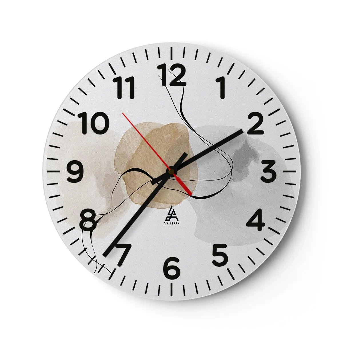 De klok is gemaakt van 4 mm dik gehard veiligheidsglas. De technologie van het maken van de klok voldoet aan de veiligheidsklasse 2B2 volgens de PN-EN 12600: 2004-norm, die weerstand tegen schokken garandeert. De klok op het glas is klaar om op te hangen - hij heeft een metalen hanger aan de achterkant van de klok en een schuimafstand die de even afstand tussen de klok en de muur regelt. De klok heeft een stil zwevend mechanisme dat wordt aangedreven door een batterij van 1,5 V - AA-batterij (batterij niet inbegrepen).