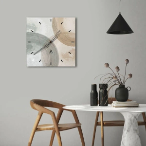 De klok is gemaakt van 4 mm dik gehard veiligheidsglas. De technologie van het maken van de klok voldoet aan de veiligheidsklasse 2B2 volgens de PN-EN 12600: 2004-norm, die weerstand tegen schokken garandeert. De klok op het glas is klaar om op te hangen - hij heeft een metalen hanger aan de achterkant van de klok en een schuimafstand die de even afstand tussen de klok en de muur regelt. De klok heeft een stil zwevend mechanisme dat wordt aangedreven door een batterij van 1,5 V - AA-batterij (batterij niet inbegrepen).