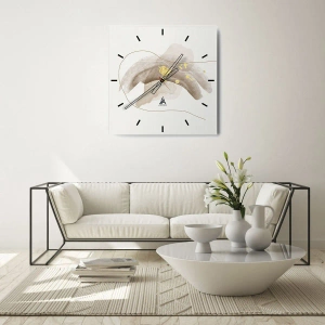 De klok is gemaakt van 4 mm dik gehard veiligheidsglas. De technologie van het maken van de klok voldoet aan de veiligheidsklasse 2B2 volgens de PN-EN 12600: 2004-norm, die weerstand tegen schokken garandeert. De klok op het glas is klaar om op te hangen - hij heeft een metalen hanger aan de achterkant van de klok en een schuimafstand die de even afstand tussen de klok en de muur regelt. De klok heeft een stil zwevend mechanisme dat wordt aangedreven door een batterij van 1,5 V - AA-batterij (batterij niet inbegrepen).