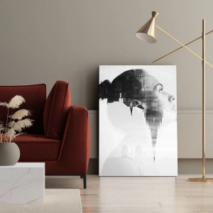 Schilderen op canvas - Portret van een vrouw met de contouren van een stad op de achtergrond, zwart-witte kleuren - 70x50cm - Aan beide zijden van het glas - Moderne wanddecoratie voor woonkamer en slaapkamer ARTTOR