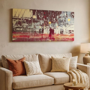 Het nachtelijke stadsmotief zit vol leven en beweging. Silhouetten van mensen op straat en de omringende lichten creëren een harmonieuze compositie die een sfeer van moderniteit en stedelijke stijl introduceert. Het schilderij is perfect voor interieurdecoratie in een woonkamer, kantoor of artistieke ruimte en voegt energie en een uniek karakter toe.