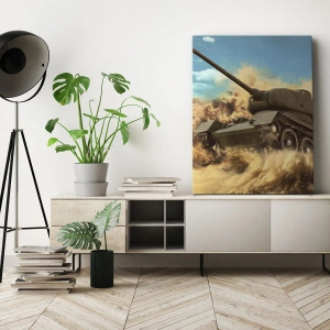 Schilderen op canvas - Een tank in actie in de woestijn, omgeven door zandstof. - 70x50cm - Niet te verslaan - Moderne wanddecoratie voor woonkamer en slaapkamer ARTTOR