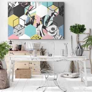 - Deze moderne canvasprint heeft een geometrisch hexagonpatroon en kleurrijke abstracte details. Het is de perfecte decoratie voor moderne of minimalistische interieurs.