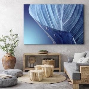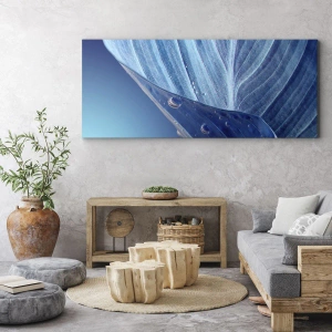 - Dit schilderij toont de details van een blauw blad versierd met waterdruppels. Een elegante en minimalistische decoratie die natuurlijke schoonheid en rust in elk interieur brengt.