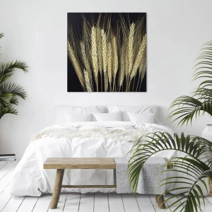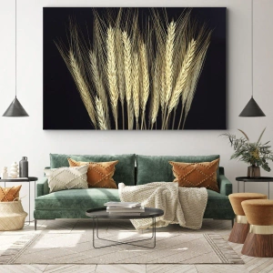 - Het schilderij toont goudkleurige tarwearen tegen een zwarte achtergrond, wat een minimalistische en rustieke compositie oplevert die perfect is voor landelijke interieurs.