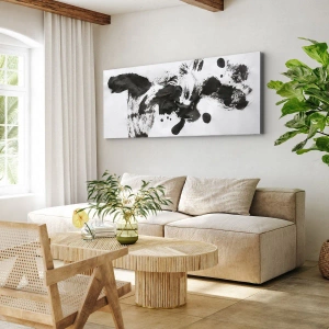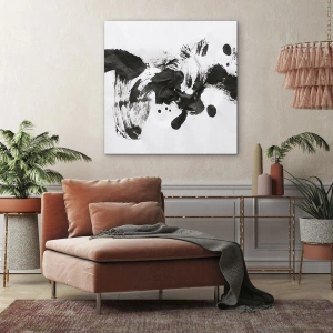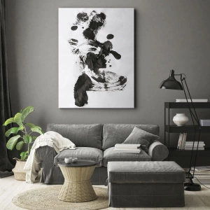 - Het schilderij toont een abstracte compositie van zwarte vlekken op een witte achtergrond, wat een opvallend contrast en evenwicht creëert tussen chaos en harmonie. Het past perfect bij moderne ruimtes en voegt een dynamische en artistieke toets toe.