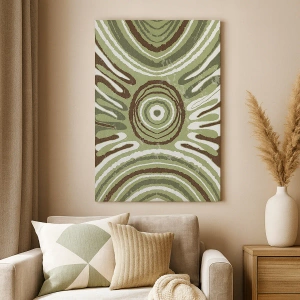 Het abstracte motief symboliseert creativiteit, balans en verbeeldingskracht en benadrukt de elegantie van het interieur. Warme tinten groen en bruin voegen harmonie en subtiliteit toe aan de compositie en creëren een sfeer van rust en inspiratie in de kamer. Het is de perfecte keuze voor wie waarde hecht aan wanddecoraties die stijl en een unieke sfeer aan het interieur toevoegen.