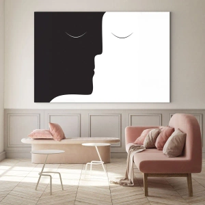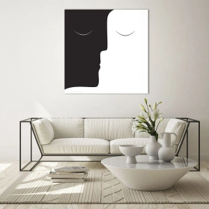 - Een modern, minimalistisch schilderij met twee gezichten in contrasterend zwart en wit, waardoor een symbolische eenheid ontstaat. Een ideale decoratie voor moderne interieurs, rijk aan emotie en symboliek.