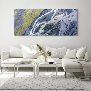 Het schilderij "Rotstekeningen van de natuur" is een buitengewone compositie die het aardlandschap vanuit vogelperspectief weergeeft. Dynamische lijnen, gecreëerd door kronkelende beekjes en natuurlijke riviertakken, vormen artistieke patronen die doen denken aan abstracte schilderijen. Het linkerdeel van de compositie betovert met intense geelgroene tinten van de aarde, terwijl het rechterdeel ruwe, donkerblauwe en grijze ruimtes toont, doorsneden door heldere waterkanalen.