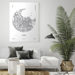 Het schilderij Anatomie van Doha is een nauwkeurig vervaardigde kaart van de hoofdstad van Qatar, gepresenteerd in de vorm van een zwart-wit afbeelding. De compositie is in een minimalistische stijl gehouden, wat het een modern karakter en elegantie geeft.
