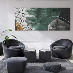 • Een moderne abstractie met groene vormen, gouden details en grafische stippen. De contrasterende compositie van dit schilderij is perfect voor loft- en minimalistische interieurs.
