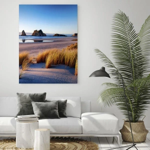 - Het schilderij toont een rustig strandlandschap bij zonsopgang, met zand, gras en rotsen op de achtergrond. Een natuurlijke compositie in warme kleuren, perfect voor ontspannende en ruime interieurs.
