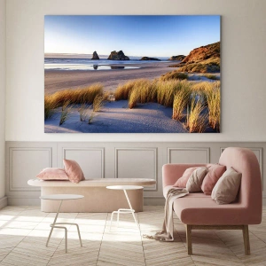 Het glasschilderij "Voor Vredezoekers" toont een pittoresk strandtafereel dat een sfeer van vrede en rust creëert. Op de voorgrond zien we tere, goudgele grassen die uit het zand groeien, en op de achtergrond rotsen en zachte zeegolven, verlicht door het licht van de dageraad. Warme kleuren en zacht licht creëren de perfecte sfeer voor ontspanning.