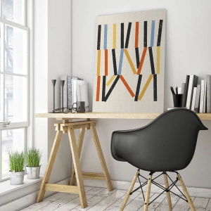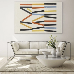 • Het schilderij toont een abstracte compositie van horizontale en diagonale strepen in verschillende kleuren tegen een lichte achtergrond. De moderne, geometrische vorm is ideaal voor minimalistische en designinterieurs.