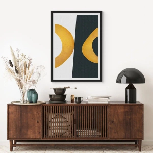 Deze intrigerende poster presenteert een abstracte compositie met opvallende gouden en donkergroene vormen. Geometrische patronen brengen harmonie en balans in de ruimte, en intense kleurcontrasten voegen dynamiek toe aan het geheel. Gouden accenten tegen een achtergrond van donkere tinten creëren een effect van elegantie en moderniteit, perfect passend bij hedendaagse interieurs.