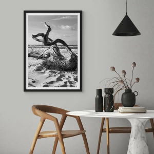 Poster in een zwarte lijst - Zwart-witfoto van een droge boom op het strand - 50x70cm - Zee sculptuur - Moderne wanddecoratie voor woonkamer en slaapkamer ARTTOR
