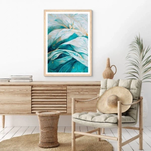 Een poster in een licht eiken lijst - Blauwe abstractie met een gouden motief - 100x70 cm