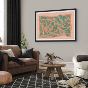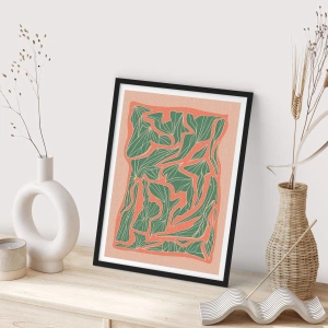 Poster in een zwarte lijst - Abstract bladpatroon in tinten groen en terracotta - 50x70cm - De strijd tussen koraal en groen - Moderne wanddecoratie voor woonkamer en slaapkamer ARTTOR