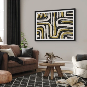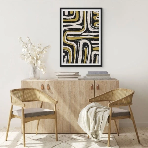 Poster in een zwarte lijst - Geometrische abstractie in zwart, beige en goud - 50x70cm - Compositie: wegen en steegjes - Moderne wanddecoratie voor woonkamer en slaapkamer ARTTOR