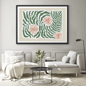 Poster in een zwarte lijst - Abstracte afbeelding van bladeren en bloemen op een beige achtergrond - 50x70cm - Bloeiend in het groen - Moderne wanddecoratie voor woonkamer en slaapkamer ARTTOR