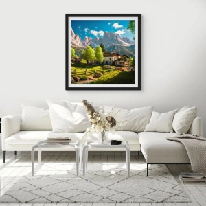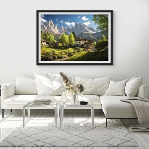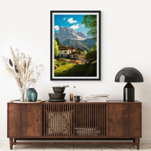 Poster in een zwarte lijst - Een bergdorp aan de voet van majestueuze bergtoppen - 50x70cm - Alpine idylle - Moderne wanddecoratie voor woonkamer en slaapkamer ARTTOR