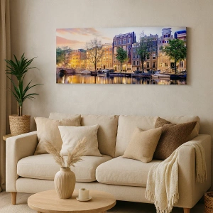 Het canvas wordt over het frame gespannen. De zijkanten en randen zijn bedrukt en zetten het beeld voort. De schilderij is klaar om aan de muur te hangen. Elk product heeft een hanger aan het frame en een montagekit (schroef + pin).