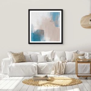 Poster in een zwarte lijst - Roze abstractie achter een blauw gordijn - 50x50 cm
