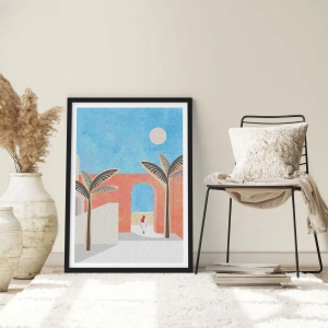 - De poster toont een minimalistische setting met palmbomen, een architectonische boog en een figuur in de verte. Pastelkleuren en een subtiele compositie creëren een harmonieuze, ontspannen sfeer.