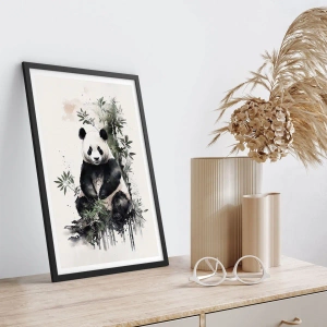 De kleuren van de poster zijn gebaseerd op gedempte kleuren - het klassieke zwart-wit, kenmerkend voor een panda, domineert, aangevuld met tinten groen en beige. De achtergrond heeft een subtiele, gestructureerde structuur die lijkt op natuurlijk papier. Hierdoor past het werk in een minimalistische en artistieke stijl, terwijl het een realistische uitstraling behoudt.