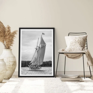Poster in een zwarte lijst - Een zeilschip met grote zeilen dat over de zee vaart in zwart-wit - 50x70cm - Broeders van de wind - Moderne wanddecoratie voor woonkamer en slaapkamer ARTTOR