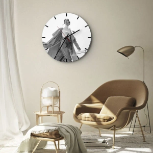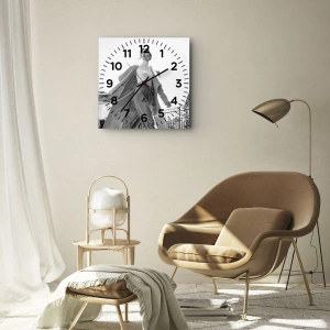 De klok is gemaakt van 4 mm dik gehard veiligheidsglas. De technologie van het maken van de klok voldoet aan de veiligheidsklasse 2B2 volgens de PN-EN 12600: 2004-norm, die weerstand tegen schokken garandeert. De klok op het glas is klaar om op te hangen - hij heeft een metalen hanger aan de achterkant van de klok en een schuimafstand die de even afstand tussen de klok en de muur regelt. De klok heeft een stil zwevend mechanisme dat wordt aangedreven door een batterij van 1,5 V - AA-batterij (batterij niet inbegrepen).