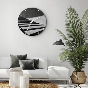 De klok is gemaakt van 4 mm dik gehard veiligheidsglas. De technologie van het maken van de klok voldoet aan de veiligheidsklasse 2B2 volgens de PN-EN 12600: 2004-norm, die weerstand tegen schokken garandeert. De klok op het glas is klaar om op te hangen - hij heeft een metalen hanger aan de achterkant van de klok en een schuimafstand die de even afstand tussen de klok en de muur regelt. De klok heeft een stil zwevend mechanisme dat wordt aangedreven door een batterij van 1,5 V - AA-batterij (batterij niet inbegrepen).