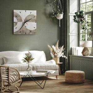 De klok is gemaakt van 4 mm dik gehard veiligheidsglas. De technologie van het maken van de klok voldoet aan de veiligheidsklasse 2B2 volgens de PN-EN 12600: 2004-norm, die weerstand tegen schokken garandeert. De klok op het glas is klaar om op te hangen - hij heeft een metalen hanger aan de achterkant van de klok en een schuimafstand die de even afstand tussen de klok en de muur regelt. De klok heeft een stil zwevend mechanisme dat wordt aangedreven door een batterij van 1,5 V - AA-batterij (batterij niet inbegrepen).