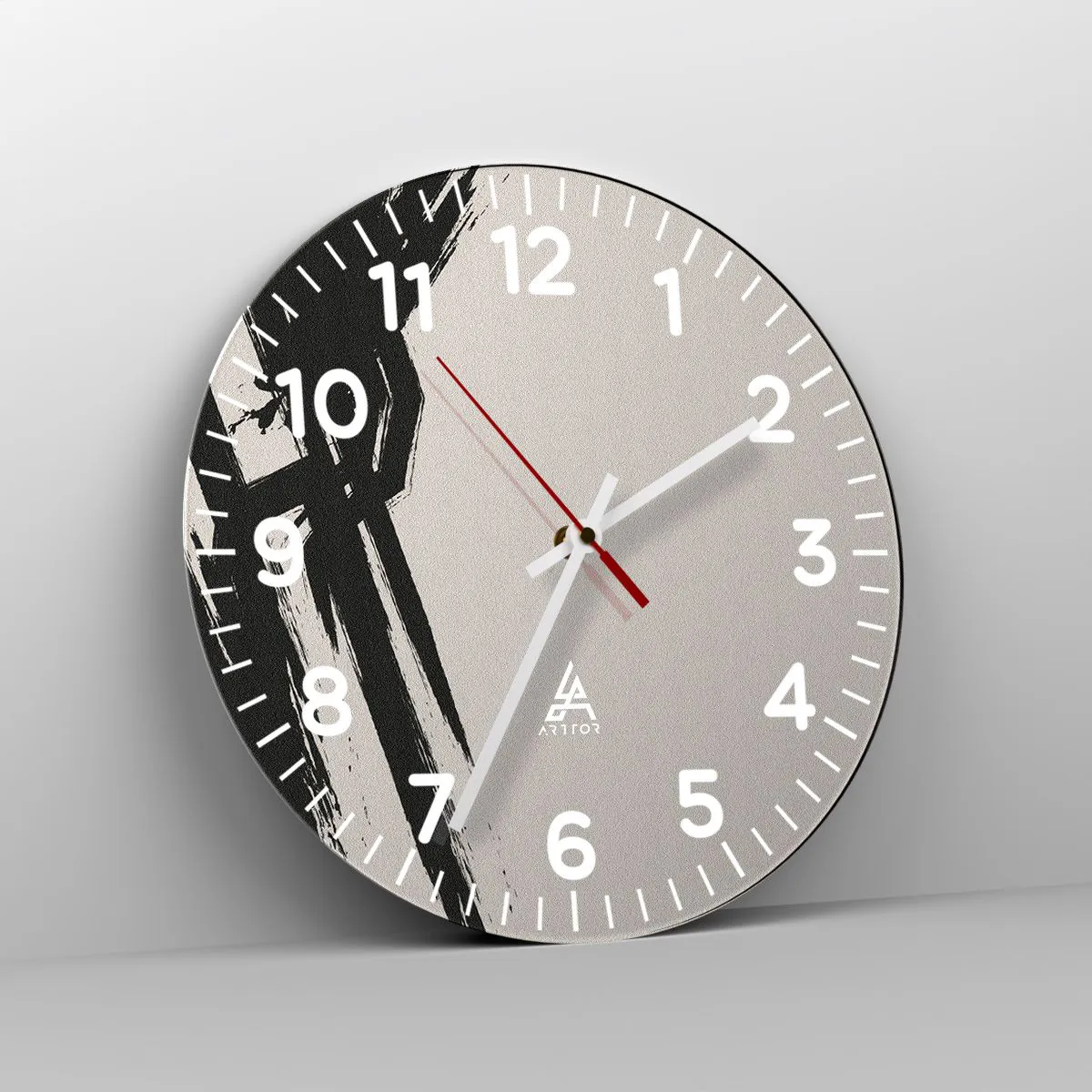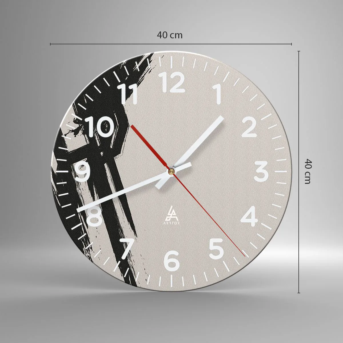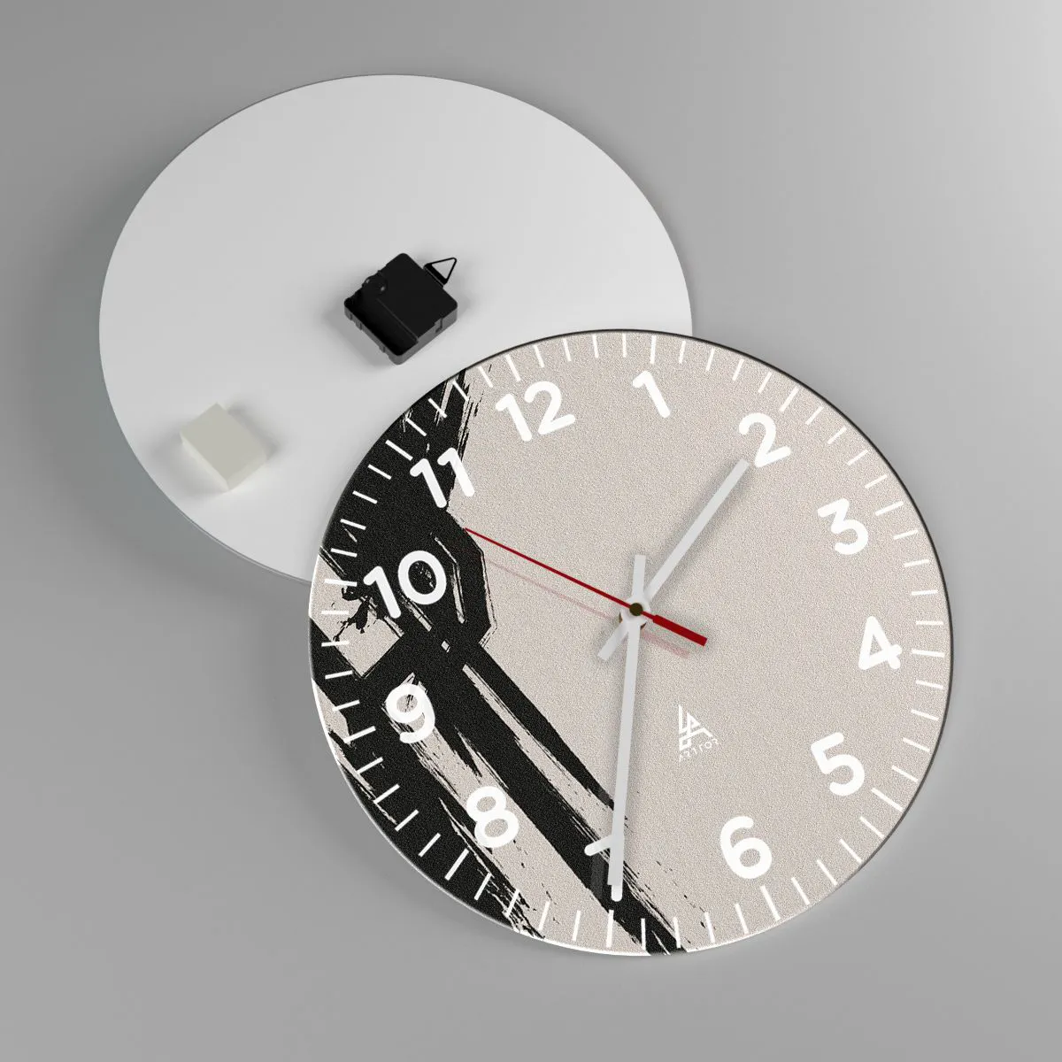 De klok is gemaakt van 4 mm dik gehard veiligheidsglas. De technologie van het maken van de klok voldoet aan de veiligheidsklasse 2B2 volgens de PN-EN 12600: 2004-norm, die weerstand tegen schokken garandeert. De klok op het glas is klaar om op te hangen - hij heeft een metalen hanger aan de achterkant van de klok en een schuimafstand die de even afstand tussen de klok en de muur regelt. De klok heeft een stil zwevend mechanisme dat wordt aangedreven door een batterij van 1,5 V - AA-batterij (batterij niet inbegrepen).