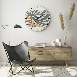 De wandklok met veelkleurig blad presenteert een artistieke en moderne visie op vormen geïnspireerd door de natuur. De wijzerplaat heeft een symmetrische compositie van organische vormen die lijken op bladeren of plantenfragmenten. Aardse kleuren domineren – groen, roestbruin oranje, beige en bruin – die perfect harmoniëren met de lichte achtergrond.
