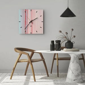 De klok is gemaakt van 4 mm dik gehard veiligheidsglas. De technologie van het maken van de klok voldoet aan de veiligheidsklasse 2B2 volgens de PN-EN 12600: 2004-norm, die weerstand tegen schokken garandeert. De klok op het glas is klaar om op te hangen - hij heeft een metalen hanger aan de achterkant van de klok en een schuimafstand die de even afstand tussen de klok en de muur regelt. De klok heeft een stil zwevend mechanisme dat wordt aangedreven door een batterij van 1,5 V - AA-batterij (batterij niet inbegrepen).