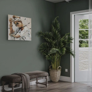 De wandklok "Portret in het volle zonlicht" is een decoratief stuk met een duidelijk gedefinieerde artistieke identiteit. Op de wijzerplaat staat een portret van een vrouw met een grote zonnebril, geschilderd met de impastotechniek, d.w.z. een dikke laag verf aangebracht met een kwast of paletmes. De schildering bekoort door de textuur en plasticiteit, waardoor een bijna sculpturaal effect ontstaat dat de voorstelling verlevendigt en uniek maakt.